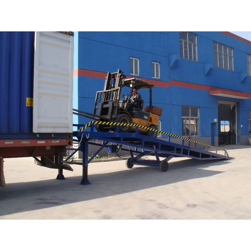 移動式登車橋是固定式登車橋的姊妹產(chǎn)品,它主要應(yīng)用在車站、碼頭、工廠倉庫等貨運量大,但又不方便做貨臺的場所,能夠在地面和運輸車輛之間搭起一座橋,使叉車使得地行駛,達到裝卸貨目的,該設(shè)備一端與地面接觸,另一端搭接在車廂后緣上,并能根據(jù)不同車型及裝車過程中車廂的變化,自動調(diào)整高度,從而大大提高工作效率。主體部分采用矩形管焊接而成,強度高,承載能力大;液壓系統(tǒng)采用進口手壓泵,安全耐用;橋面采用高強度鋼板網(wǎng),增加了磨擦系數(shù),便于叉車的行駛,減輕了橋體的自身重量,使移動更加靈活。